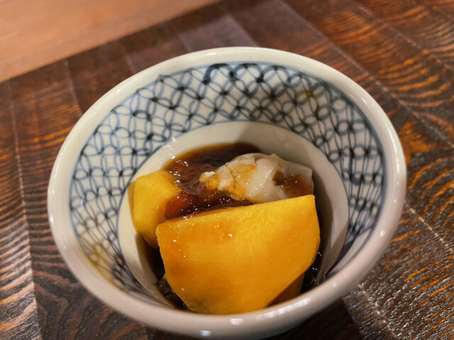 2品目は海の幸と山の幸をジュレで和えた小鉢。。。最初はネーミングの語呂合わせかと思いましたが、不思議なほど絶妙な組み合わせ。。。牡蠣の濃厚な美味さを柿の爽やかな甘みが美味く調和しております。