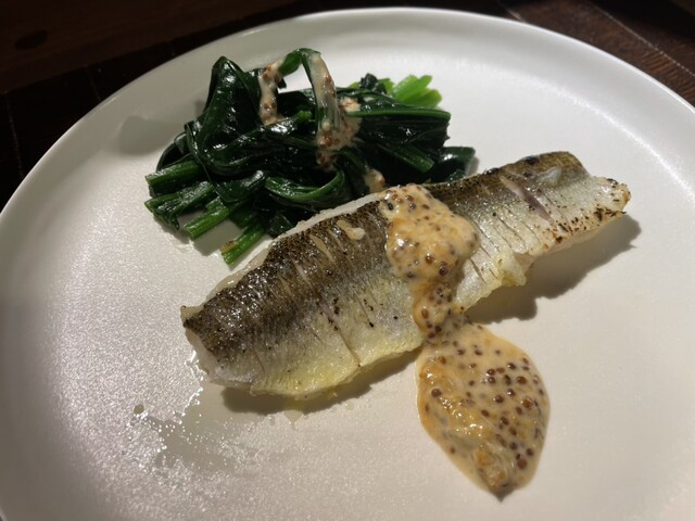 ご主人の業は洋風料理でも冴えまくりです。。。オリーブオイルで香ばしく焼き上げたカマスをマスタードソースでいただきますが、自家製で寝かせたカマスの甘さと酸味が絶妙なマッチング。。。付け合わせの契約農家から仕入れた生で食べられるほうれん草のうまさもすごかった。。。