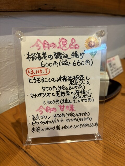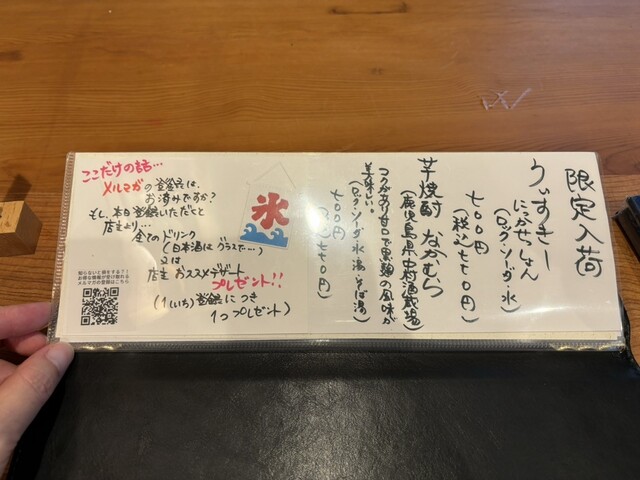 とある平日の18時頃に入店。。。カウンターでもよかったのですが、テーブル席を案内されます。。。ふと見ると”〇〇様 本日は暑い中ご来店ありがとうございます”というメッセージが。。。こういう細やか心配りってマジ嬉しいです。。。