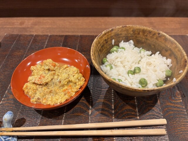 ・ うすい豆の炊き込みご飯と香箱蟹のかに玉