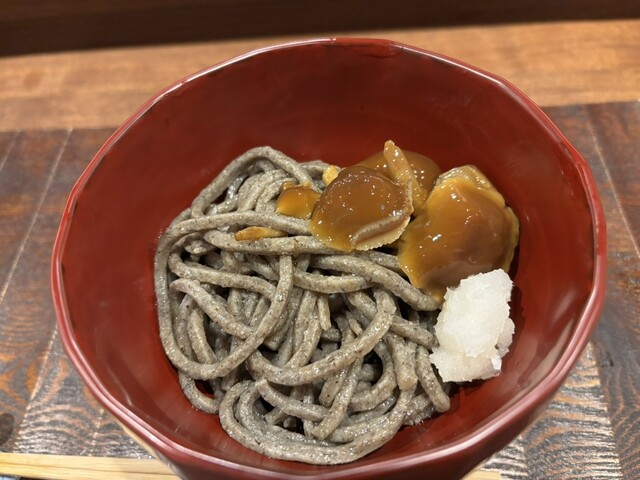 最後の蕎麦はお得意の黒そば。。。通常のもりの他、この日はなめこおろしもできるとのことですので、こちらをチョイス。。。熟成蕎麦ならではのもちもちした食感とごついまでの食べ応え。。。なめこや大根おろしによるさっぱり感が加わると更に美味しく感じました。。。