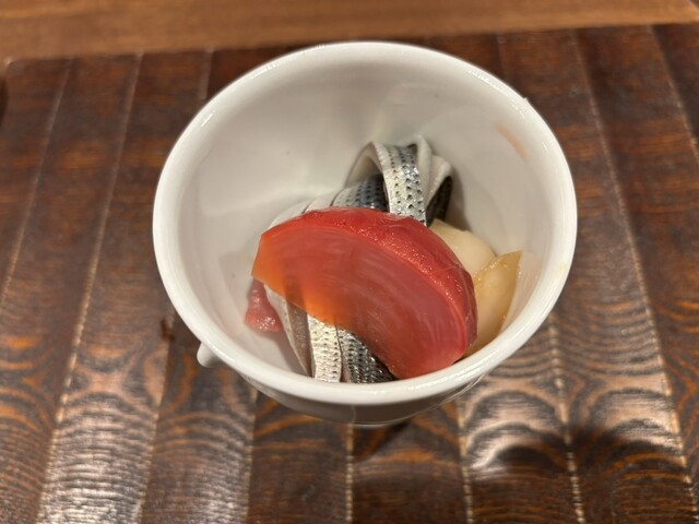 2品目は柔らかく炊いた赤カブと、酢で〆た小肌の細切り、同じ細さにカットされた新鮮な帆立を一緒にした小鉢。。。絶妙な〆加減の小肌の酸味と帆立の身の甘さ。。。そこに赤カブの自然な甘味ととろけるような食感の組み合わせが絶妙でした。。。