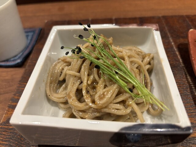 ここから怒涛の食事メニューラッシュ。。。最初は固めに茹でた蕎麦に上質な油をたっぷり使い蕗をたっぷり混ぜた味噌で和えた蕎麦。。。超上品な汁無し担々麵とでもいいましょうか、走りの蕗のほろ苦さと上品な味噌ダレの味わいは絶品でした。