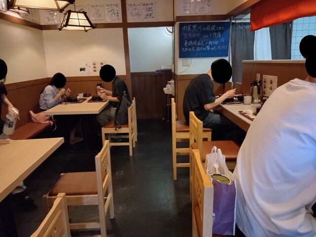 今日も、家からテクテク歩いて向かった先は、宇治で、いつも待客の列ができているステーキ重専門店『肉屋 黒川 宇治本店』さん~!! 場所は、宇治市宇治里尻、『宇治橋西詰』の交差点の近くの府道15号線沿いにある~!! 京阪宇治駅、JR宇治駅の両駅から徒歩5分ほどのところ~!! 11時40分頃、店到着!! 9名ほどの待客の列~!! 今日は、いつもより待客が少ない!! 良かった~!! 店頭で30分ほど待って店内にイン~!! 最初に、入って左側にある券売機で食券を購入する~!! 店内は、カウンター5席とテーブル8席の合計13席ほどの席数~!!( ^o^)ノ