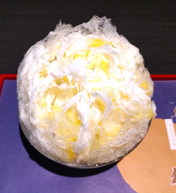 薄くスライスされた氷は立っており、氷の間から黄色のシロップが見えている~!! 黄色のシロップは、かぼちゃシロップで、