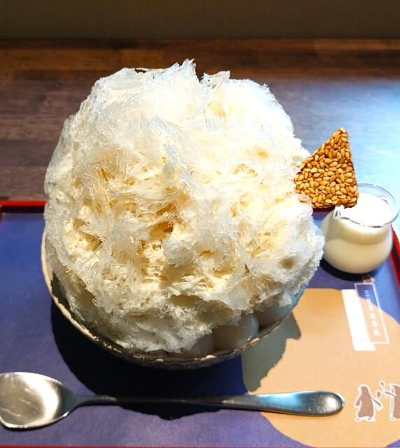 見た目、淡いベージュ色した白ごまのシロップと白ごまがかかっていて、白玉、三角の白ごま煎餅が添えられている~!! また、白ごまの香ばしい香りが感じられた~!! 氷を絡めて食べると、白ごまの香ばしさと優しい甘さが感じられ、氷の口溶けの良さはいつもの通り絶品~!! 練乳をかけるとミルキーな甘さが増して、めちゃめちゃ美味しいじゃん~!!d( ̄◇ ̄)b グッ