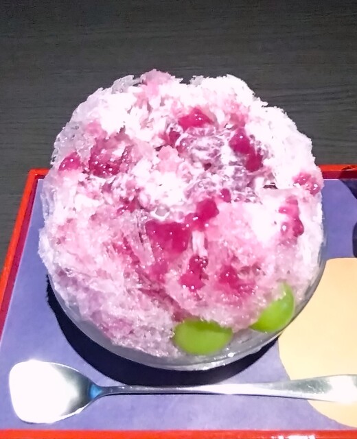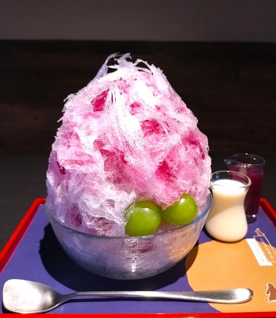 見た目、薄くスライスされた白い氷の間から紫色(巨峰色)が見え、シャインマスカットが2粒添えられているかき氷~!! それに別添えの巨峰シロップと練乳をかけて食べる~!! 氷の中には、巨峰を潰した粒が入っており、氷を絡めて食べると、氷の口溶けの良さはいつも通り絶品~!! 巨峰の果実感、旨み、甘みが感じられ、めちゃめちゃ美味しい~!! それに、後かけの巨峰シロップによって、巨峰の味わい、旨みがより際立ち、後かけの練乳、中に入っているミルクアイスの味が加わることにより、ミルキーさが増して、巨峰の味わい、旨みに、ミルクの旨み、甘みが増して、シンプルながらも、めちゃめちゃ美味しいかき氷~!!( ^o^)ノ