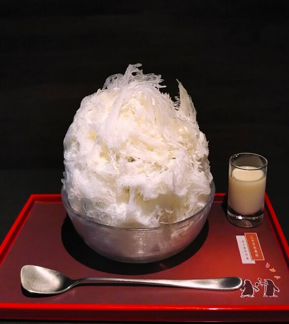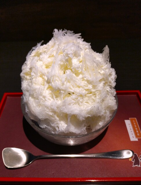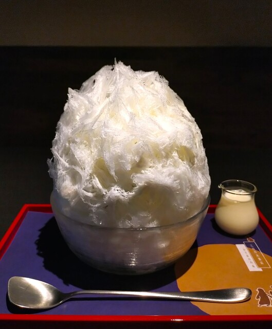 見た目、真っ白なシロップがかかっているだけのシンプルなかき氷~!! そこに後かけで、練乳をかけて頂く~!! 氷を絡めて食べると、氷の口溶けの良さはいつも通り絶品~!! 練乳のミルキーな旨み、甘みが増して、めちゃめちゃ美味しいかき氷~!! また、中に入っている小豆が、粒の一つ一つから、ほどよい甘さと旨みが感じられ、めちゃめちゃ美味しい小豆だぁ~!! さらに練乳を絡めると、もう、もう、ミルキーで甘いもの好きな人には堪らない味わいで、いくらでも食べられそう~!! 中には、ミルクアイスではなく、抹茶アイスが入っていて、ほんのり香る抹茶の味が良いアクセントになっている~!! 途中で、熱いお茶とお菓子を頂き、胃腸の調子を整えてから、再度食べると、今日2杯目のかき氷なのに、最後まで、あっという間に完食できました~!! 一言で言うと、口溶けの良い氷にミルキーな甘み、小豆の旨み、甘みに、ほのかな抹茶の味わいを堪能できたかき氷~!!( ^o^)ノ