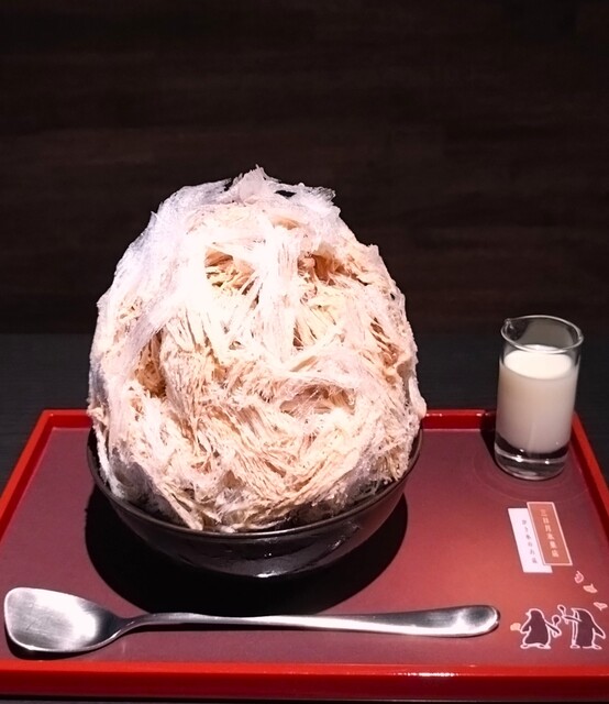 氷の質感が、まるでカンナで削ったかのように薄く、繊維状に細かく削られている~!! この氷は、口に入れると一瞬で溶けてしまうほど薄くて軽い食感〜!!( ^o^)ノ