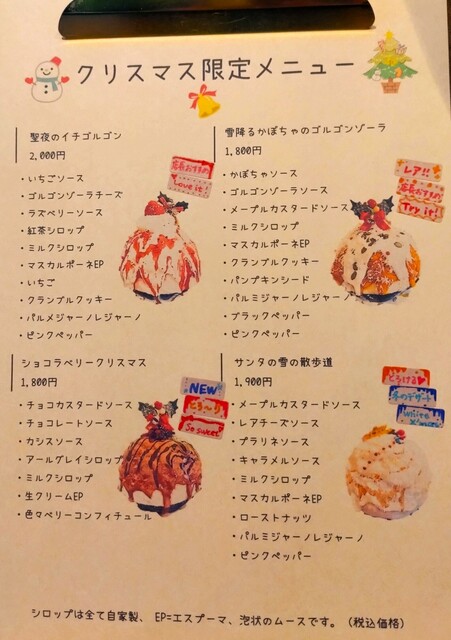 見た目、真っ白なシロップをかけ、その上からパラミジャーノレッジャーノチーズをかけることによって、表面をサラサラにし、サンタとピンクペッパーを並べることで、雪の積雪感とサンタの足跡をうまく表現している~!! ピンクペッパーは甘い~!! 氷を絡めて食べると、白いシロップはメープルシロップで、口に含むと、メープルの甘さ、味わいが感じられる~!! また下には、ミルクシロップがかかっていて、氷の中には、ローストナッツ、キャラメルソース、マスカルポーネクリームが入っている~!! 中のローストナッツのカリカリっとした食感が良いアクセントになっている~!! メープルの甘さに、キャラメルの甘さ、ミルキーな味わいと甘さが絡み合って、めちゃめちゃ美味しい甘さに仕上がっている~!!( ^o^)ノ