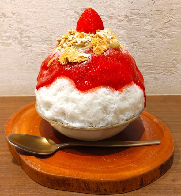 かき氷に、甘いいちごミルクがかかっており、その上から、果実感と酸味のある濃厚ないちごシロップがラインのようにかかっていて、マスカルポーネクリームといちごが盛り付けられている〜!! 甘いいちごミルクといちごの果実感と酸味を感じられるいちごシロップの部分を食べ分けることにより味の変化が楽しめ、また、マスカルポーネクリームを絡めて食べるとめちゃめちゃ美味しい〜!! 氷の中には、カスタードクリームといちごが入っており、2種類のシロップとクリームを絡めらながら、いちごとクリームの味を味わえるかき氷〜!!( ^o^)ノ