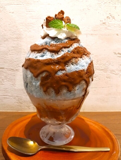 濃いチェリー色のシロップとチョコレート色のシロップが、交互にたっぷりかけられ、上にマロンクリーム、きざみ栗が盛りつけられ、粉糖がかかっている~!! マロンクリームは濃厚で、ねっとりとして甘く、下には少しのミルクエスプーマクリーム~!! 氷にかかっているチェリーシロップは甘酸っぱく、チョコシロップは濃厚でめちゃめちゃ甘い~!! チェリーシロップの酸味が、濃厚なチョコシロップの甘さを和らげているものの、チョコの甘さの方が勝っていて強く感じる~!! 氷の中に入っている きざみ栗は柔らかくって、栗の味わい、旨みが感じられて美味しかった~!! 最後は、底のミルクシロップによって、ミルキーな味わいになったが、最後までマロンクリームとチョコの濃厚な甘さを強く感じられ、マロン好き、チョコ好き、甘いもの好きな人には堪らない、マロンとチョコの甘いかき氷~!!( ^o^)ノ