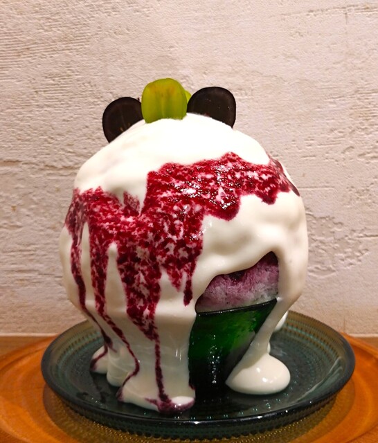 見た目、白色のクリーム、パープル色のクリームソースがたっぷりかかっており、その上にさらに、白色のクリームがかかって、シャインマスカット、ナガノパープルが添えられている〜!! ヨーグルトクリームの酸味に、杏仁クリームの甘み、ナガノパープルシロップの爽やかな甘みのバランスが絶妙で、めちゃめちゃ美味しい〜!! 中に入っているぶどうの旨みが凝縮したレーズンのねっとりとした食感が良いアクセントになっていて、白(シャインマスカット)と黒(ナガノパープル)の高級ぶどうの両方の味が堪能できた、まさに名前の通り『至高』のかき氷だぁ~!!( ^o^)ノ
