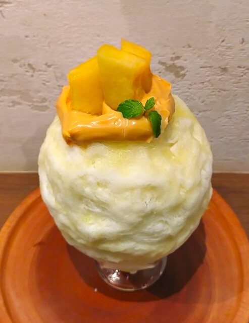 黄色のメロンシロップがかけられ、上に塩キャラメルカスタード、生メロンが盛りつけられている~!! 生メロンは、フレッシュでジューシー、ほんのり甘くって、メロンの旨み、甘さが充分に感じられ美味しい~!! その下の塩キャラメルカスタードは、塩がキャラメルカスタードの甘さをより際立たせている~!! 氷を絡めて食べると、メロンシロップはメロンの果実感、旨みが感じられ、さっぱりした味わい~!! そこに塩キャラメルカスタードを絡めると、濃厚なキャラメルカスタードの甘さが強く感じられ、さっぱりメロンとの相性が良い~!! 氷の中には、生メロン、ミルクが入っていて、ジューシーなメロンと、塩キャラメルカスタードの濃厚な甘み、ミルクの甘みのバランスが良く、最後まで美味しく頂きました~!!( ^o^)ノ