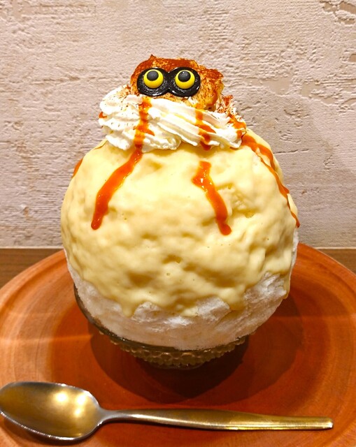 人気のゲームソフト名をモジッた名前のかき氷〜!! 白みそシロップがたっぷりかかったかき氷に、頭の部分がいもクリームで目がついて、キャラメルソースで足を表現し、蜘蛛モンスターのように仕上げている〜!! 氷を絡めて食べると、白みそと焼いも、さつまいもクリームは、芋の風味、旨みを感じ、ほんのり甘く、ほっこりとした味わいで、めちゃめちゃ美味しい~!! 氷の中には、柔らかく煮込まれた煮りんごと、レモンクリーム(カスタード)が入っており、煮りんごの柔らかい食感と甘酸っぱさ、ちょっぴり酸味の効いたレモンクリームが、爽やかでさっぱり感をだしており、良いアクセントになっていている~!! 最後は、溶けた氷に白みそミルクシロップやいもシロップが絡んで、ミルキーで甘くって最後まで美味しかった~!!( ^o^)ノ