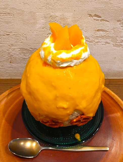 かき氷に、黄色のクリームがたっぷりかかって、プレツェルを車輪に見立て、その上にエスプーマクリーム、黄桃が盛りつけられている〜!! まさにかぼちゃ(黄色)の馬車のように仕上げられている~!! かぼちゃ(黄色)クリームは、濃厚でほっこりした味わいで、ほんのり甘い~!! 黄桃は、マンゴーのように甘くって柔らかくってとろけるような食感~!! 氷の中には、甘い栗あんが入っていて、栗のまろやかさと味わいがしっかり感じられて美味しい~!! 氷が溶けると、甘いかぼちゃとミルクシロップで、ミルキーな味わいになって最後まで美味しく頂きました~!!( ^o^)ノ