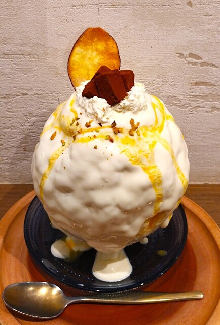 リニューアル1周年記念メニュー!! 白いシロップがたっぷりかけられ、その上からみかんシロップ、生チョコ、いもチップが盛りつけられている~!! ホワイトチョコシロップは濃厚で甘いが、カルダモンシロップからスパイシーな香り、みかんシロップから柑橘系の酸味が感じられる~!! ホワイトチョコの濃厚な甘みに柑橘系の酸味が爽やかさを出していて美味しい~!! 氷の中には、小さくカットされたさつまいもが入っており、さつまいもの柔らかくって粘り気のある食感とほっこりした甘さを感じる~!! 溶けると、ホワイトチョコの濃厚なミルクの味にみかんの甘み、酸味が良いアクセントになっていて、爽やかミルクのミルキーな味わいになって最後まで美味しかった~!!( ^o^)ノ
