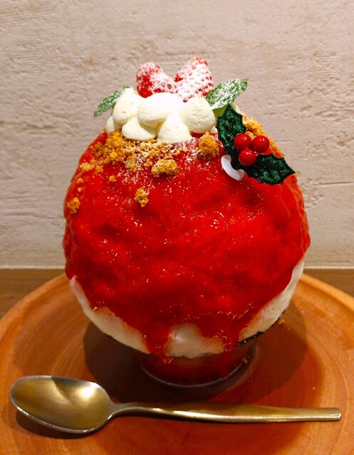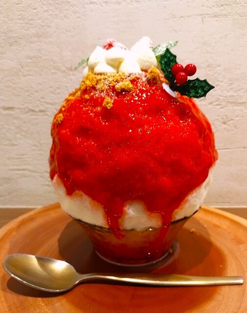 見た目、真っ赤ないちごシロップがかかって、ホイップクリーム、いちご、セイヨウヒイラギの飾りが盛りつけられて、オーツハニークランブル、粉糖がかけられている真っ赤なかき氷~!! 氷を絡めて食べると、まず、オーツハニークランブルのサクサクした食感が心地よく、良いアクセントになっている〜!! さらに、いちごシロップの甘酸っぱさとミルクシロップの甘さが感じられ、中には、ホイップクリーム、カステラ、いちごが入っており、まるで、いちごショートケーキのような味わいで、めちゃめちゃ美味しかった〜!! また、 最後は溶けて、いちごミルクの甘い味わいになり、最後まで美味しく頂きました〜!!( ^o^)ノ