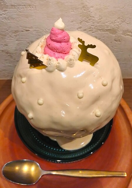 真っ白なジャスミンミルクシロップがたっぷりかかっていて雪を表現し、ピンク色したラムクリームが小さなサンタ帽で、まるでサンタが雪の中に忘れた帽子のように表現されている~!!( ^o^)ノ