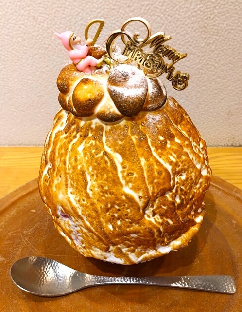 全体的にメレンゲがたっぷり盛りつけられており、それをバーナーで焼いて焼色をつけて、サンタの人形とクリスマスプレートを盛りつけている〜!! 氷を絡めて食べると、メレンゲは、焦げた香りを感じるが、表面はパリッとしていて、中はふわっふわ〜の軽い食感で甘~い!! それに酸味のあるラズベリーシロップが絡んで、甘酸っぱさを感じる~!! また、中に入っているピーカンナッツキャラメリゼがカリカリっとしていて良いアクセントになっていて、甘~い!! メレンゲのふわっふわ~で甘い軽い食感から始まり、ラズベリーの甘酸っぱさ、ピーカンナッツキャラメリゼのカリカリっとした甘い食感が癖になりそうなかき氷だった~!!( ^o^)ノ
