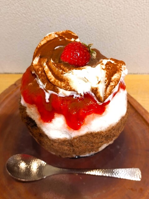かき氷全体にミルクシロップがかけられ、上部は、トロトロのいちごシロップ、ミルクエスプーマ、カカオパウダーがかけられ、一番上にいちごが添えられている!! 下部には、ショコラシロップがかけられている~!! 氷を絡めて食べると、ふんわりふわっふわ~の軽い食感のミルクエスプーマは生チョコの味がして、氷の中にもミルクエスプーマ生チョコといちごが入っていて美味しい~!! 全体的には、上部は生チョコの甘さといちごの甘酸っぱさ、中部はミルクの甘さ、下部はショコラとミルクの甘さを感じ、全体的には甘酸っぱさよりもチョコの甘さがひきたっているかき氷で、ミルク、チョコ好きにはたまらない味わいで、めちゃめちゃ美味しかった~!!( ^o^)ノ