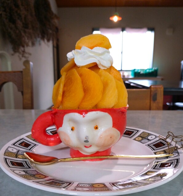人の顔した容器に、かき氷、その上に『梶屋柿農園(和歌山)』さんの薄くスライスされた『ひらたね柿』がたっぷり盛りつけられている〜!! その上にエスプーマクリームとひらたね柿〜!! 薄くスライスされたひらたね柿は、シャキシャキして甘くって美味しい〜!! 下の氷には、柿と紅茶のシロップ、ミルクシロップがかけられ、ほんのりミルキーで、あっさり、さっぱりした味わい〜!! 氷の中には、ヨーグルトクリーム、ほうじ茶ゼリーが入っており、ヨーグルトクリームの酸味とほうじ茶ゼリーのぷるんぷるんした食感が良いアクセントになっていて、こちらもめちゃめちゃ美味しいフルーツかき氷〜!!( ^o^)ノ