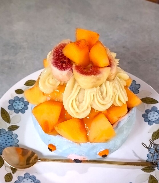 青いくまさん?の容器に、ぶつ切りにした『ひらたね柿』がたっぷり盛りつけられ、シルクスイートのお芋クリーム、上にイチジクと『ひらたね柿』が盛りつけられているかき氷〜!!(^o^)丿