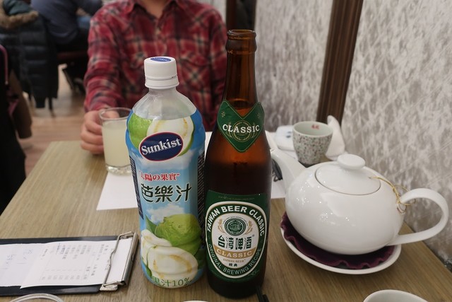 微妙に日本語の混じるサンキストのジュースと台湾ビール。