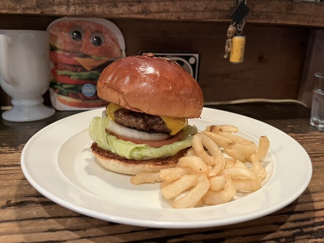 高さのあるボリューム!粗挽き肉感たっぷりパティ、こんがりバンズ、野菜も結構入ってます。ソースも相性良し、美味しいです!チーズ入れましたが、バーガー自体で主張が強いので、かなり目立たない…。