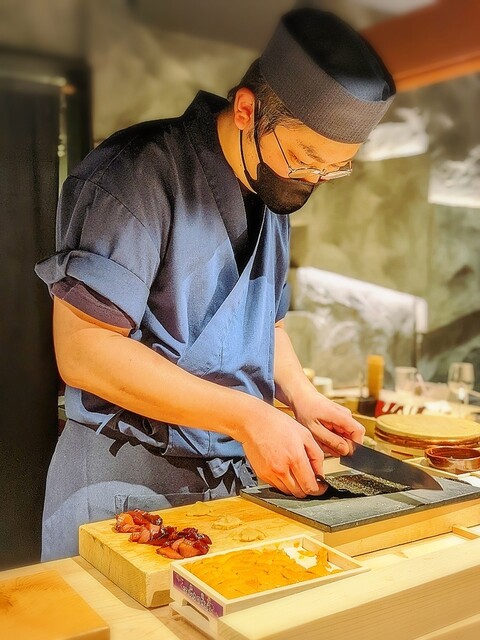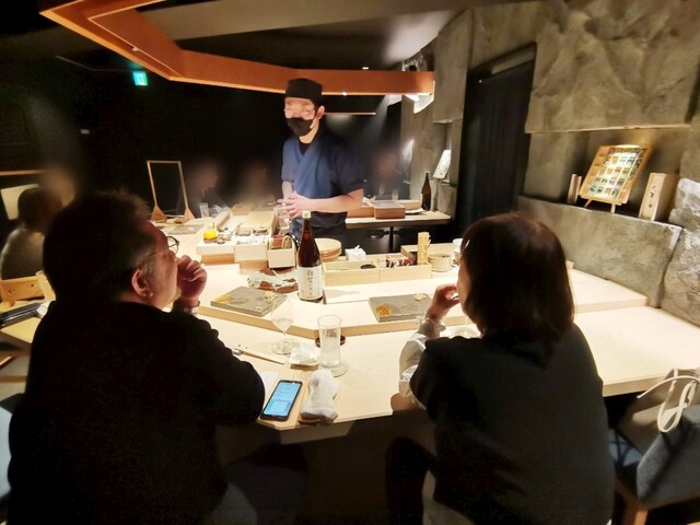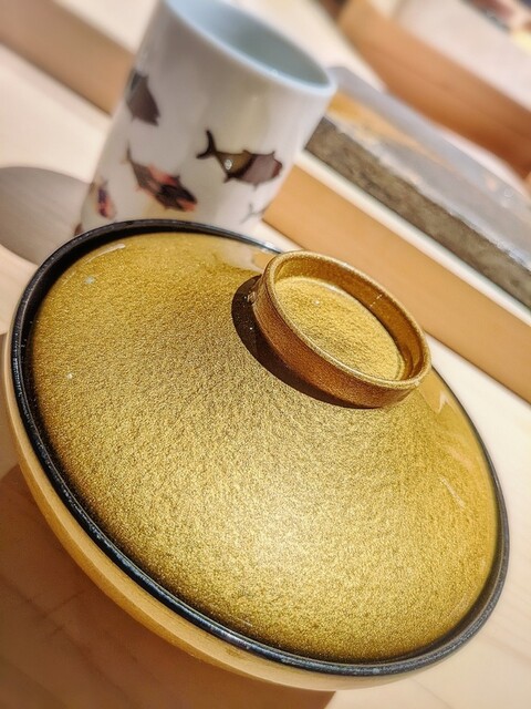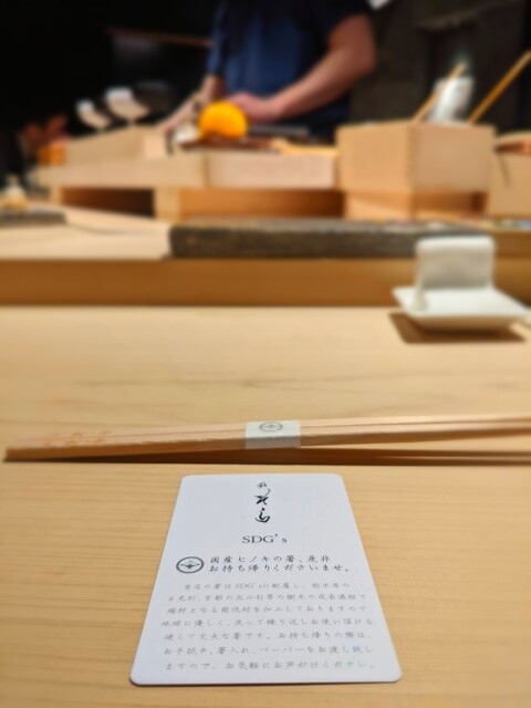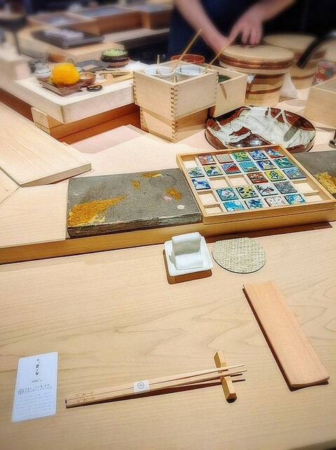 店内は明るめの柔らかい照明で美しい五角形のカウンターなので何処に座っても大将の手捌きやパフォーマンスが拝見出来るしグループで行っても会話がしやすい感じでとても良きです。