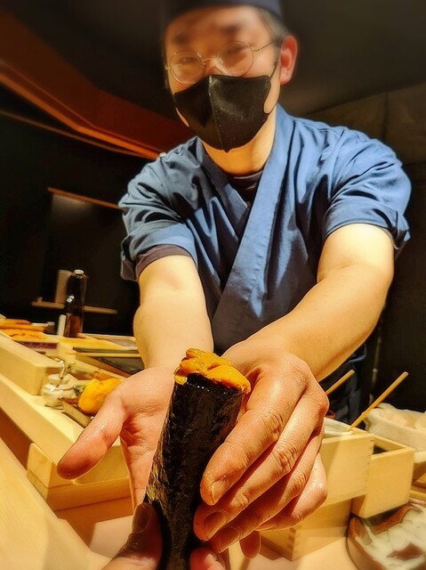 最上部は馬糞雲丹山盛りで大将から手渡しで