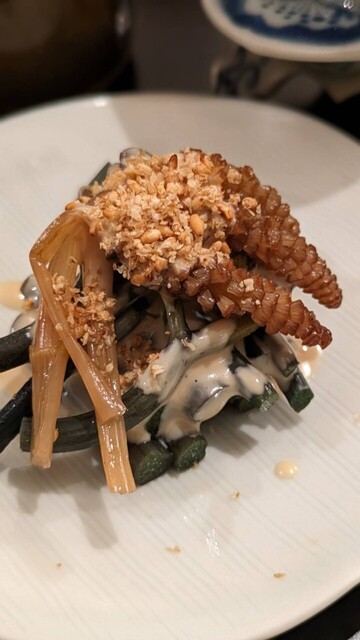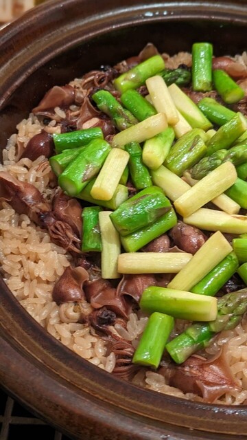 最後の蛍烏賊と猪脂で炒めたアスパラの