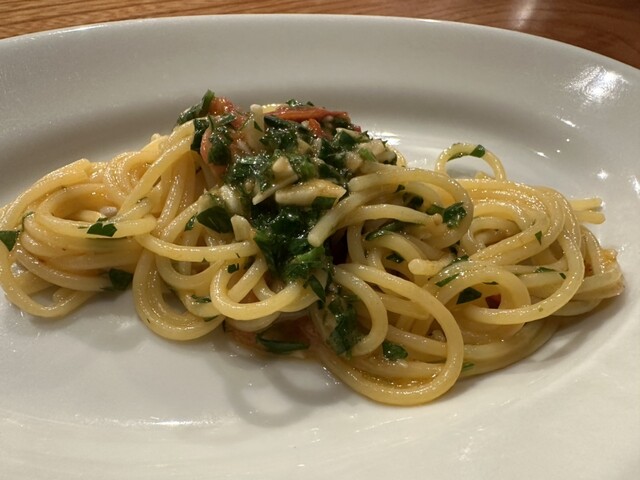 締めのパスタはお腹いっぱいだったので、シンプルに少しだけ。アーリオオーリオソースのねっとり具合が最高でした。