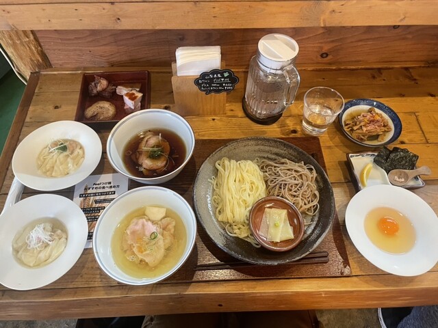 Feelつけ麺スープダブル+出汁卵変更+スープ出汁割り+肉雲呑+海老雲呑+チャーシュー皿+めんま+ライス