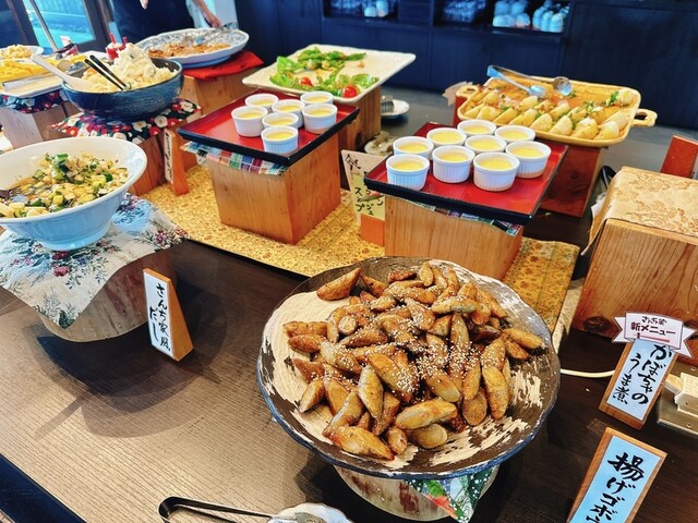 他にも夏野菜ペペロンチーノ、ポテトサラダ、グラタン、生野菜、季節のだし、とうもろこしご飯、ポテトサラダ、麻婆豆腐、卵焼き、煮卵、蒟蒻の甘辛煮、ししとうのチーズ焼き、コーンポタージュ冷製、車麩の焼肉風などなど・・・・・美味しすぎて手が止まらずお腹パンパン!
