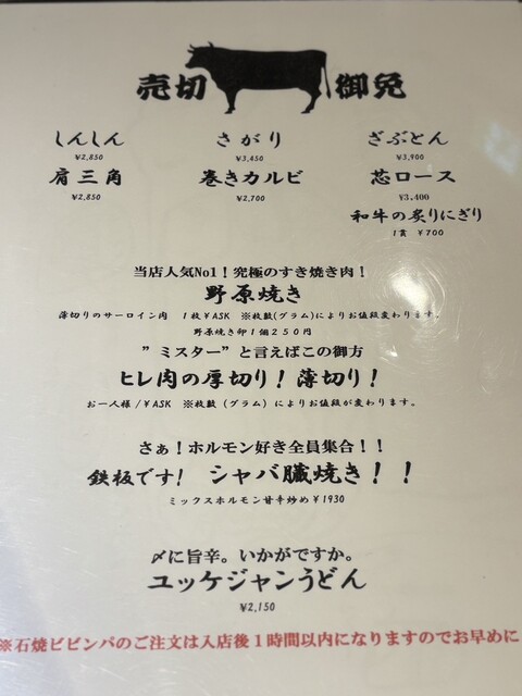 まずは評判の高いハツと、ひとり1枚限りの黒毛和牛上タン、そして、サーロインの薄切りをすき焼きダレとお好みで卵でいただく、名物の野原焼きを。