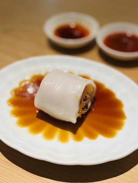 お次は腸粉。米粉のトロッとした生地に包まれた海老と揚げ湯葉のカリッとした食感がたまらない。