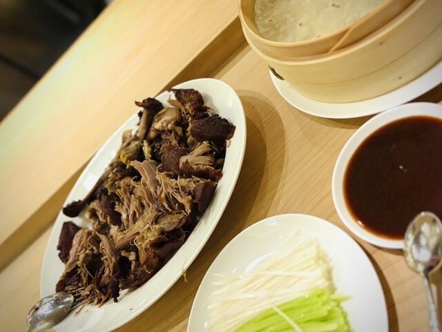 そして、クリスピーアロマダック。いわゆる北京ダックのようなものだけど、周りがスパイスと黒糖のカラメルで焼かれてコーティングされていてガリッとしている。ウェイターさんが見せてくれたあとに、ほぐしてくれる。そして、北京ダックの要領で皮に甘い甜麺醤のような味噌と、ほぐされたダック、美しく切られたきゅうりとネギの千切りをはさんでいただく。これも絶品。お肉だけ食べても美味しいが、かなりの量。