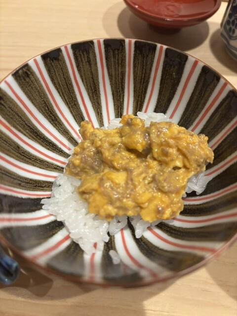 トリュフご飯 目の前でトリュフを。牛の薄切り、雲丹、卵黄、追いトリュフ。 牛肉が柔らかい。とてもバランスがいい。