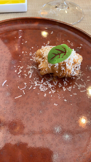 アミューズ:白子のポアレ、ジャガイモのソース:白子がトロッと。 ジャガイモは小さな角切り。 シンプルなので、白子とジャガイモの旨みが感じられました。 (デザートのかわり)