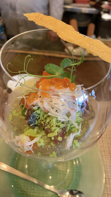 秋のレギュームグラス +800円 グラスの中の宝石です。シェフがおすすめされたので、+料金で変更しました。 雲丹、蟹、蟹みそ、いくら、桜エビの素揚げ、キュウリ、コリンキー、つるむらさき、枝豆、ジュレなど。 蟹味噌がいい。スプーンをすくって口の中へ。何が今回は入っているのか楽しみ。 レンコンと牛蒡のチップスもいい。量もたっぷり。思わず笑顔になりました。 プラス800円の価値ありです。