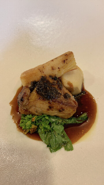 ・エイヒレのポアレ:北海道から仕入れているエイヒレだそうです。フレンチでいただくのは初めて。フレッシュなトマトのソースに合わせていました。フワッと身が美味しい。骨が身の真ん中にあります。淡泊な白身なのに、脂がのっている。とても好みの魚料理でした。トマトとの酸味とも合い、爽やかさもありました。