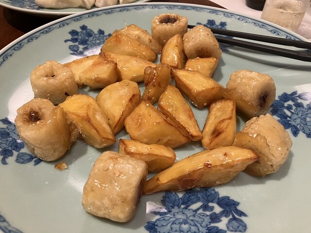 ・ポテトとバナナの餅巻きの飴炊き