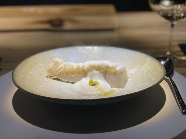 住所非公開の「トレイス」。河島シェフが手掛ける料理は、まさに唯一無二の「河島ワールド」。素材の旨みを最大限に引き出し、美味しいだけでなく美しい味わいが広がります。特にイワシをミキサーでスープに仕立て、カッペリーニと合わせた料理は言葉を失うほどの驚きの一皿。鳩のフライドチキンも、これまでの人生で出会った鳩料理の中で間違いなく一番の完成度でした。さらに、たけのこのホイル焼きはたけのこの旨みを極限まで引き出し、感動的な仕上がり。そして、この日のハイライトは蟹パン。蟹の旨みが凝縮された至高の逸品で、生涯忘れられない料理となりました。一皿一皿から河島シェフのこだわりと探究心が感じられる素晴らしい時間でした。