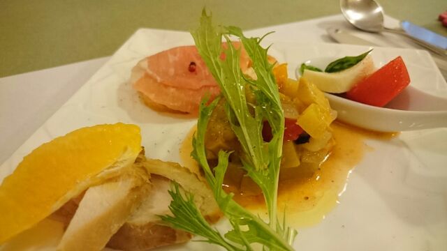 前菜盛り合わせ:ラタトイユ、鶏胸肉のスモーク、プチトマトのカプレーゼ。軽いスモークがさっぱり胸肉とばっちり!