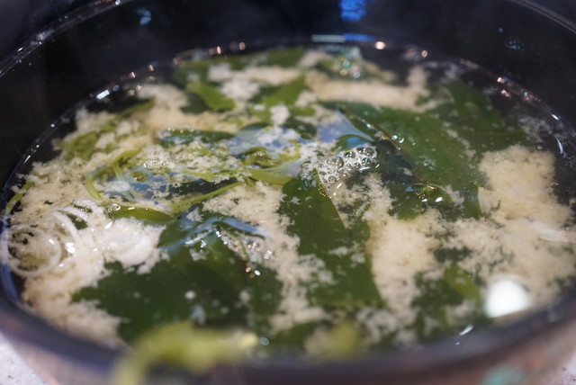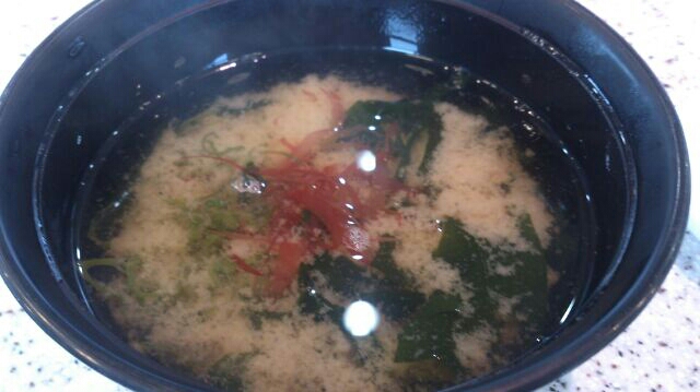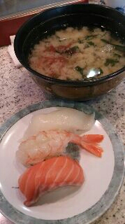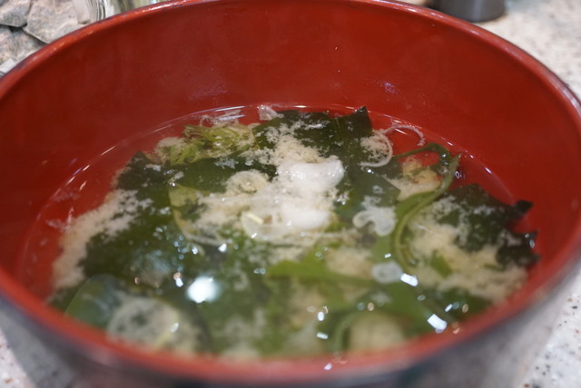 市場でみつけた3点盛り、わかめ汁(サーモン、赤エビ、イカ)