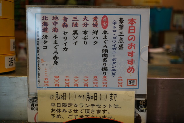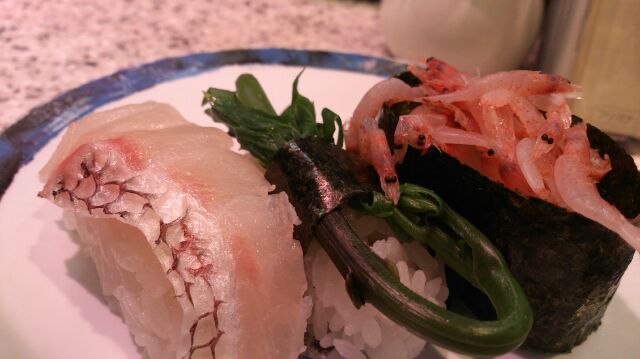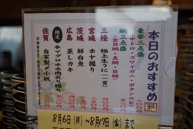 さて、この日も黒板と回転レーンの上を寿司と一緒に回っているメニューを眺めつつ食べたいものをピックアップ。