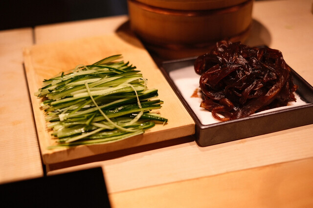 太めの水分がしっかりある胡瓜を鬘剥きにし水分量の強い真の部分は使わず、鬘剥きした部分を細かく千切りにして巻き上げたもの。