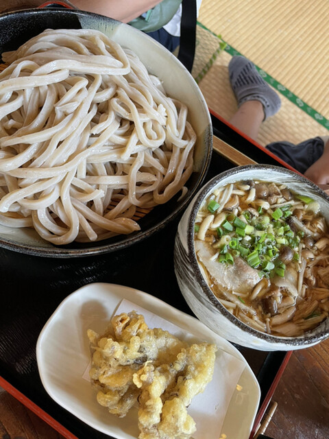 夫は冷たいぶっかけ、私はもちろん冷汁大盛、息子たちに肉汁うどん大盛りを分け合いっこ。