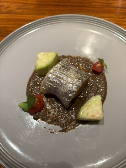 前菜プレートは、太刀魚のお刺身が絶品で、レモンに負けないインパクトのあるあぶらののった感じが秀逸。